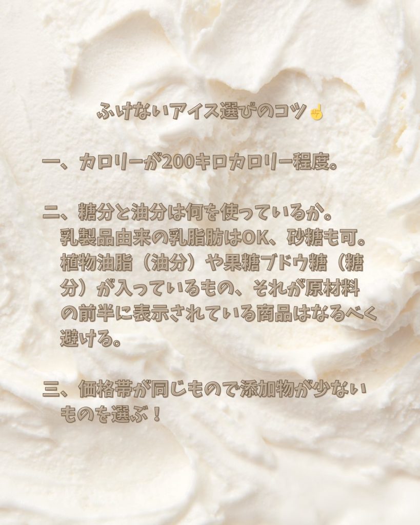 『ラクトアイス』乳固形分3.0%以上入っているもの。植物油脂が大量に配合されていて、ラクトアイス1個は、1日に必要な脂質の6割を摂取してしまうとも言われています。食べ過ぎると脂質過剰になり、ニキビや肌荒れを起こしやすくします。